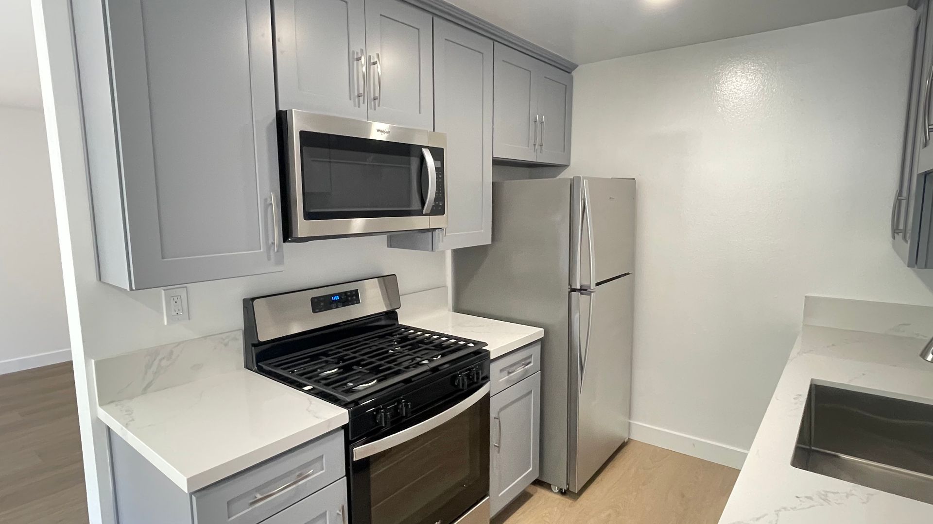 • Modern grey cabinetry with brushed nickel finishes
