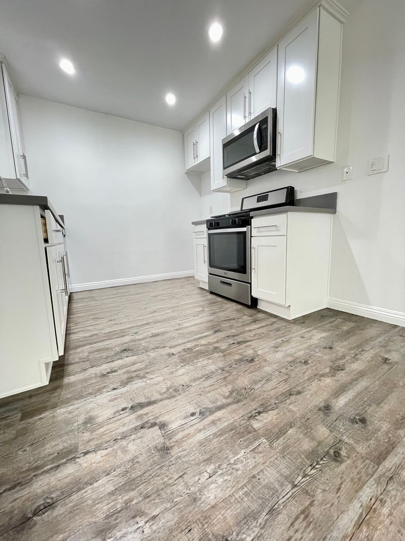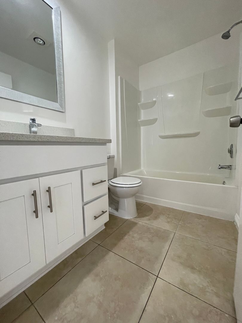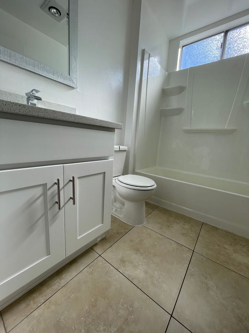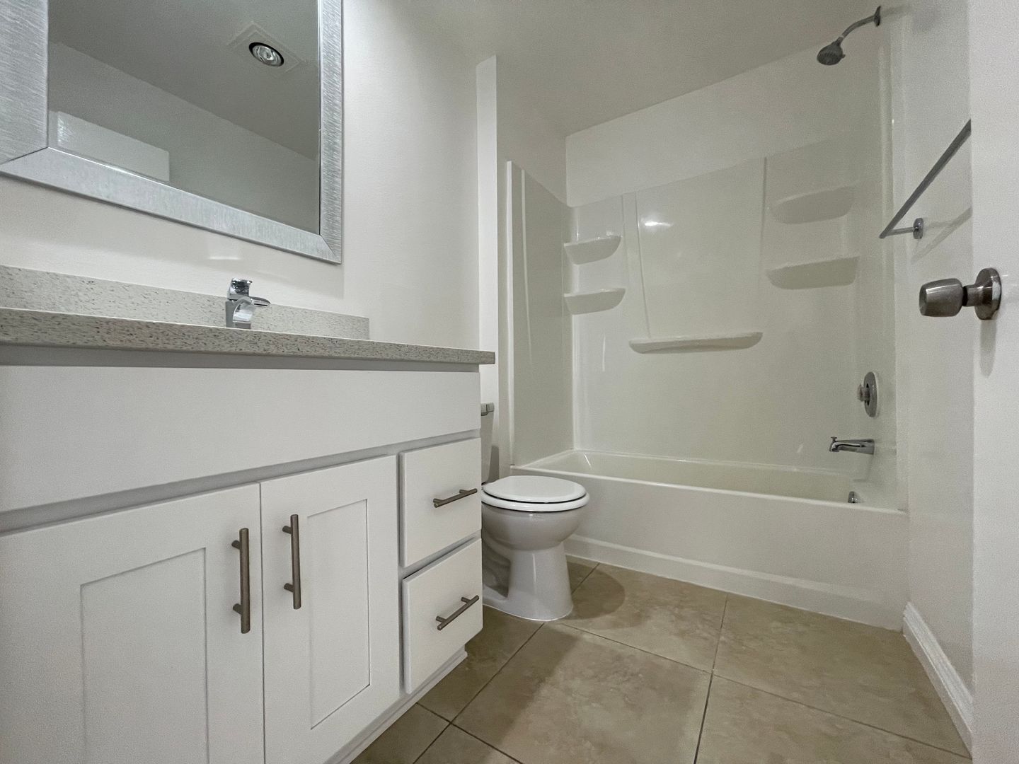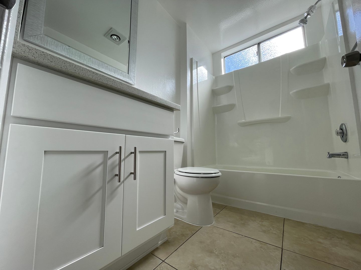 Spacious open floor plan with modern quartz stone kitchen and bathrooms